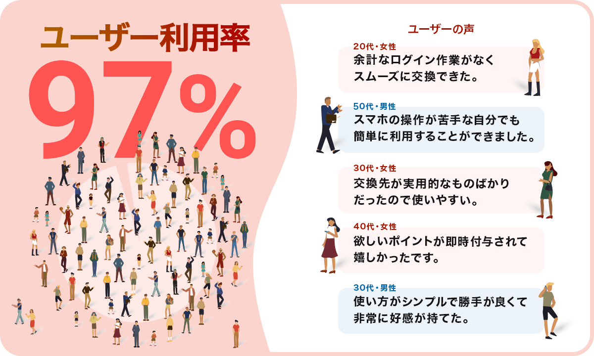 直近3ヶ月の調査で、企業から「デジコ」を受け取った全てのユーザーのうち交換先へと交換完了した割合を示すユーザー利用率は97%と非常に高く、ユーザーからの満足の声も多数いただきました。老若男女問わず幅広いユーザーに喜ばれ、きちんとご利用いただける点が大変ご好評をいただいております。