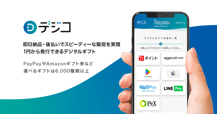 「デジコ」(https://digi-co.net/)は、初期費用・月額費用無料で、PayPayやAmazonギフトカード、Apple Gift Card、Google Play ギフトコード、QUOカードPay、LINE Pay、PeXポイントギフトなどに交換可能なデジタルギフトを、1円単位1枚から当日発行することができるサービスです。いつでもすぐに必要な分だけ発行することができるため、企業の広告予算の調整や急なキャンペーンの実施などにも柔軟に対応することができ、当日まで人数把握が難しいイベントの謝礼などにも幅広く活用することが可能です。