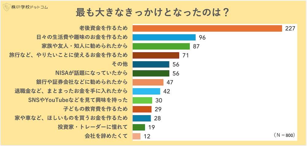 「株式投資を始めたきっかけは何ですか? あてはまるものをすべて選んでください」という質問に対して、最も多くの回答数を得たのは「老後資金を作るため」でした。800人のうち4割を超える335人(41.2%)がこの項目を選び、2位以下を大きく引き離す結果となりました。