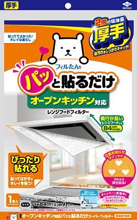 弊社が販売している、1枚で換気扇の整流板全面をカバーし、汚れたら剥がせるシールタイプの厚手フィルター「整流板付専用 パッと貼るだけスーパーフィルター」は、発売以降ご好評いただいております。対象機器となるキッチン換気扇の整流板付タイプは年々増加傾向にあり、全体の約35%を占めています。また、近年の住居形態の変化としてリビングとキッチンが壁で仕切られず、空間がつながっているオープンキッチンも増加しています。それに伴い、キッチン換気扇(レンジフード)のサイズも大きいものが増える傾向にあり、現在販売している商品では、サイズが足りない機器も出てきていることが課題でした。