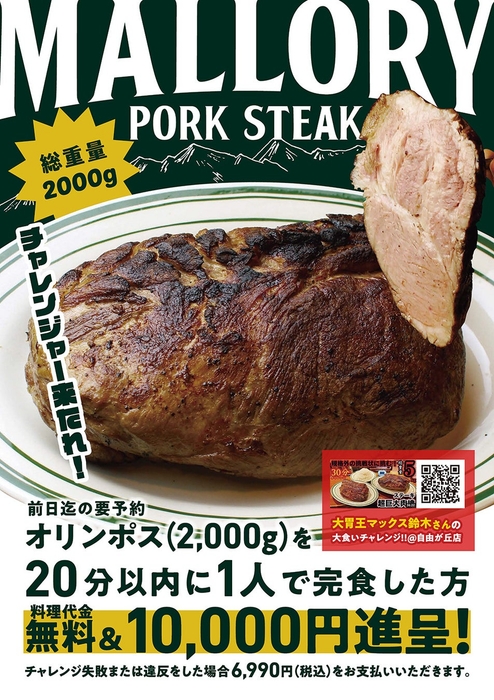 オリンポス(2kgのポークステーキ)を1人で20分以内に食べ切ることで、お食事代金を無料に加え、賞金10,000円を進呈。これまで大食いタレントや、YouTuberなどが果敢にチャレンジしてきた企画をお台場店でも実施。大食いに自信のある猛者を求めている。