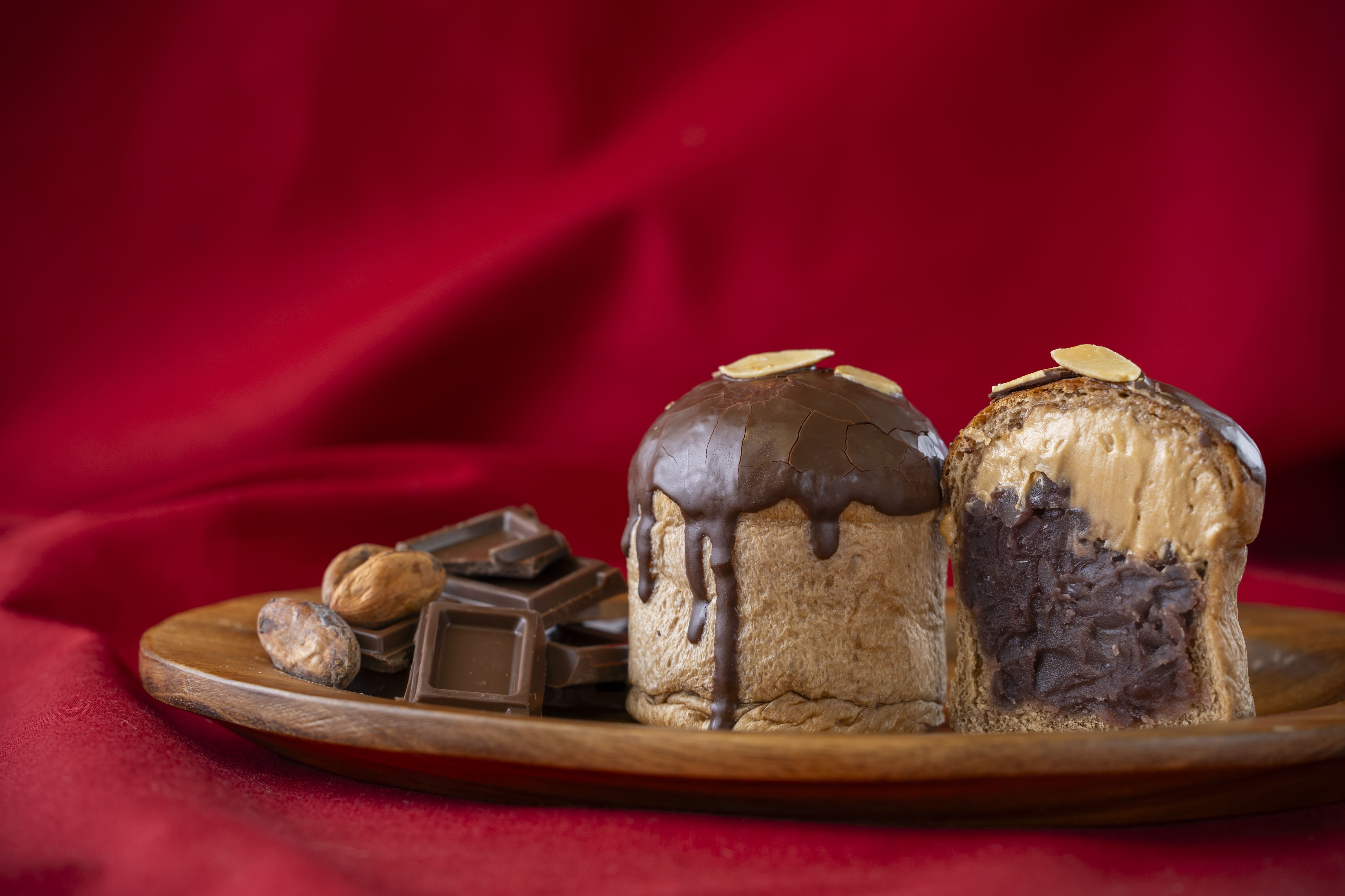 ココアパウダーを練り込んだふんわり食感のパン生地に、チョコを混ぜたバタークリームと「又一庵」の自慢の粒あんをぎっしり入れ、仕上げにアーモンドをのせて香ばしさを足しました。