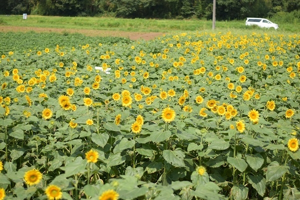 当牧場では、種を蒔く時期をずらし、異なる場所でひまわりを育成しております。この工夫によって、満開時期が短い「ひまわり」を夏休み後半までお楽しみ頂ける予定です。本会場は生育途中に鳥害を受け、開花が遅れておりましたが、本日8月6日(金)時点では、7部咲きとなりました。会場本数は約1万7500本です。被害を乗り越えて元気に開花したひまわりたち。力強い夏のエネルギーを感じることができます。