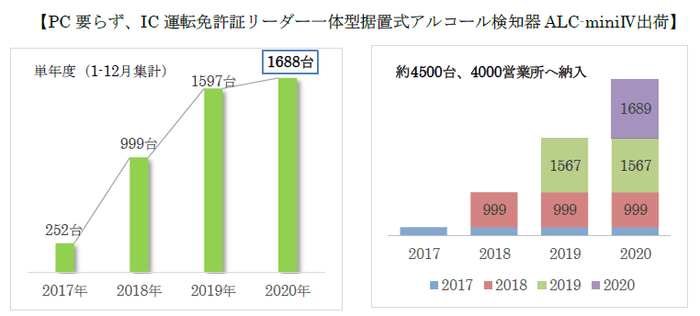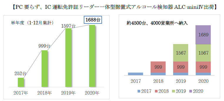 点呼機器及び運行管理用アルコール検知器を開発販売する東海電子株式会社(本社:静岡県富士市 代表取締役 杉本 哲也)は、この度、免許証リーダー一体型アルコール検知器ALC-miniⅣの4年間の出荷実績を取りまとめましたのでお知らせいたします。