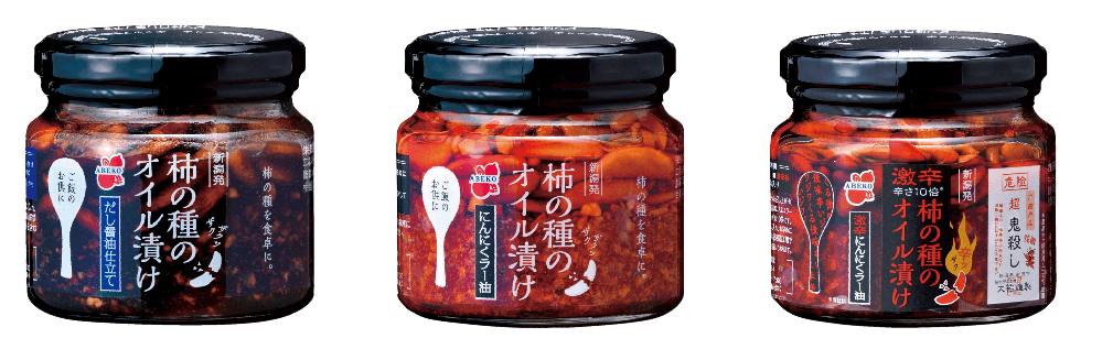 新潟名物「柿の種」を旨味たっぷりのオイルに漬け込んだ新潟土産です。2018年のシリーズ第一弾「柿の種のオイル漬け にんにくラー油」を発売以来、調味液に浸かりながらもザクザクな柿の種の食感がご好評をいただいています。現在は、かつおだしをきかせた「柿の種のオイル漬け だし醤油仕立て」、超激辛の唐辛子粉末を使用した「柿の種のオイル漬け 激辛にんにくラー油」も取り揃えています。