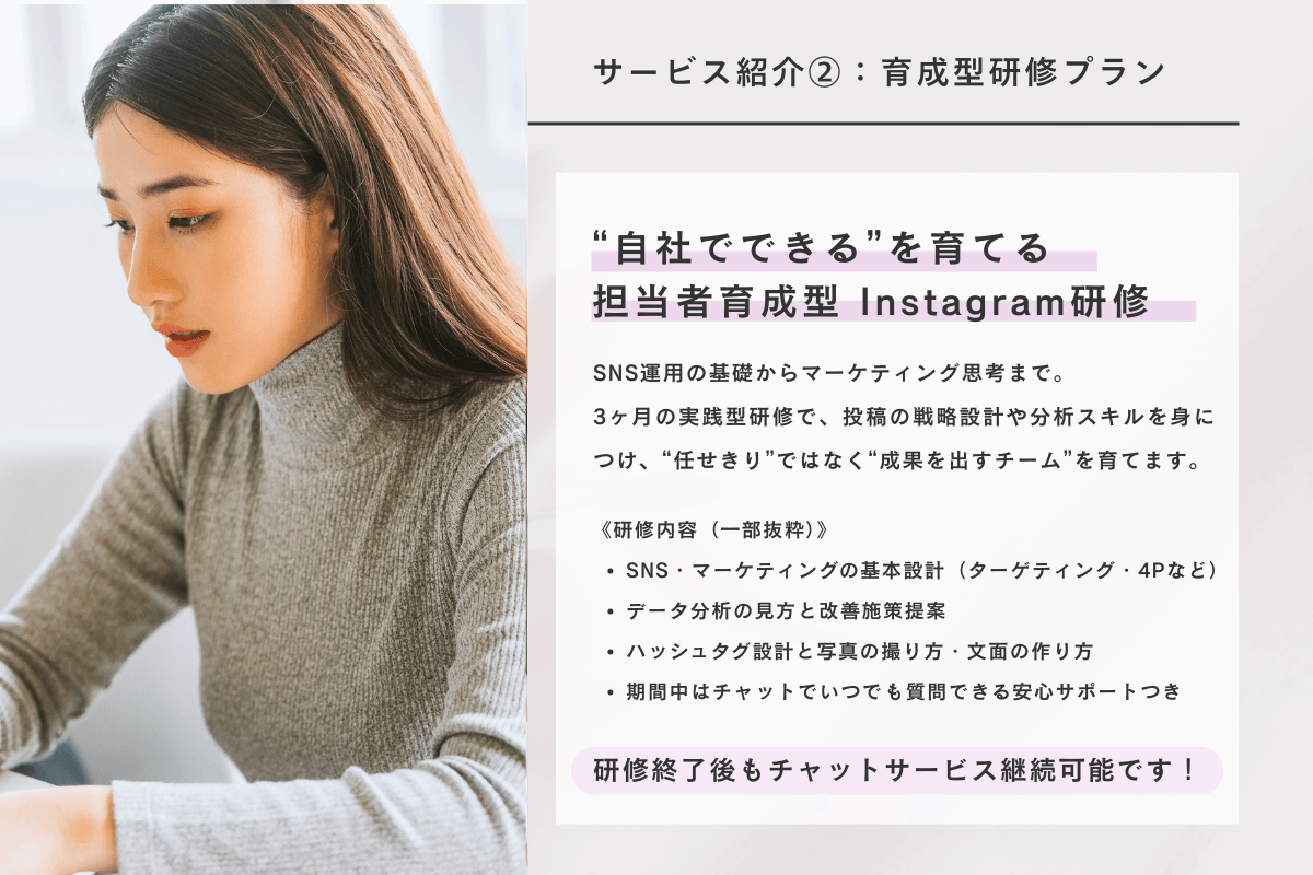 ひとつは、SNS運用のリソースが足りない企業向けに提供する「販促支援型SNS運用代行プラン」、もうひとつは、自社での継続的な運用を目指す企業向けの「Instagram担当者向け 育成型研修プログラム」です。