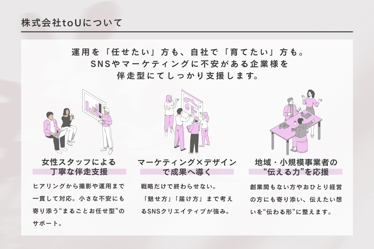こうした背景を踏まえ、株式会社toUはこれまでのSNS運用代行実績に基づき、より効果的・実務的な形での支援体制を構築。特に地方の中小企業や立ち上げ間もない企業が抱える発信の悩みに向き合うべく、運用代行と自走支援の両輪で新プランを提供いたします。