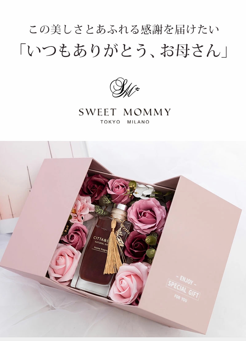 そのほかにもインテリアになるソープフラワーをメインとしたセット、オリジナルエプロンをメインとしたセット、ニュースタンダード時代にぴったりな衛生用品セットなど、スウィートマミーならではのギフトセットを多数そろえております。