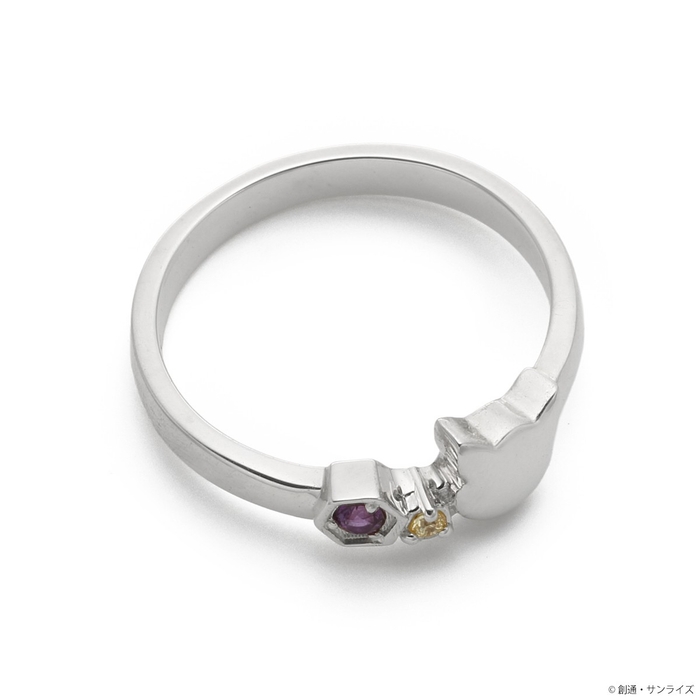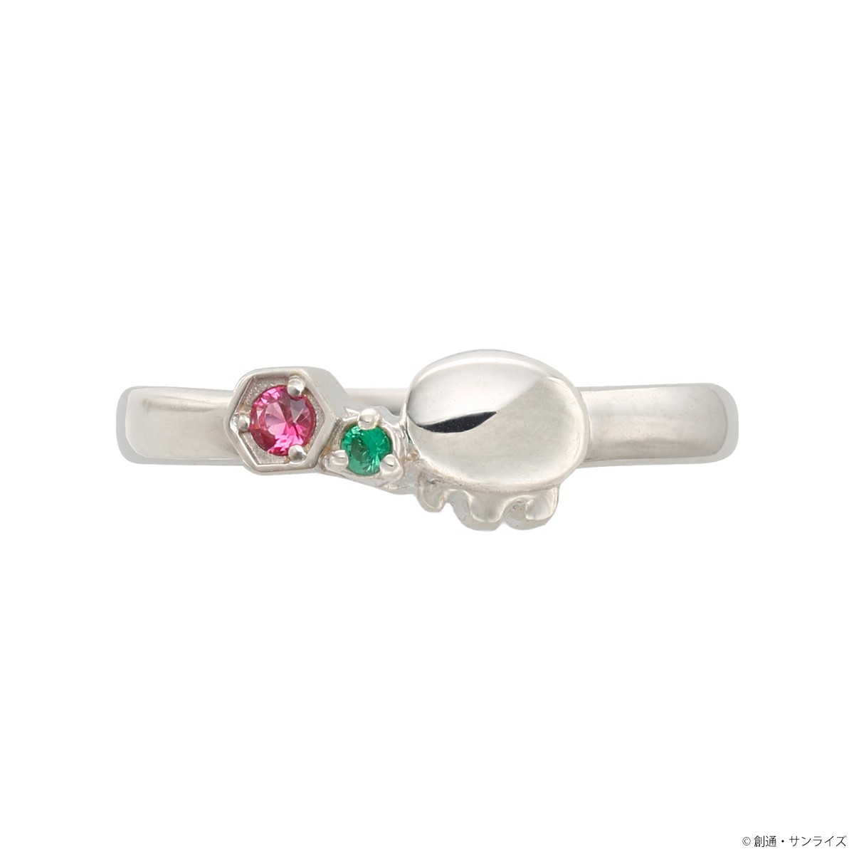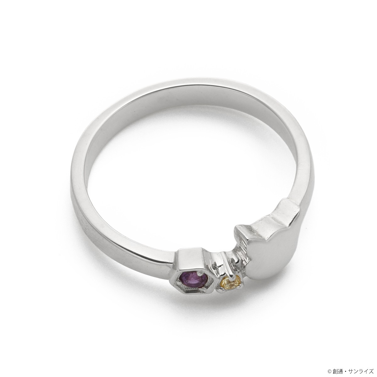 『機動戦士Gundam GQuuuuuuX』のシャリア・ブルをイメージしたシルバーリングです。中佐の胸章をモチーフに取り込んだゆるやかなV字ラインのデザインにイメージカラーストーンを2石セットしました。