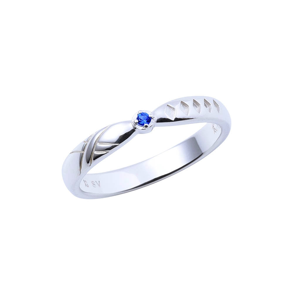 甲丸のストレートタイプのリングに、体に巻かれている包帯をモチーフとして取り込み、イメージカラーストーンをセット。内側には名前を刻印しました。
