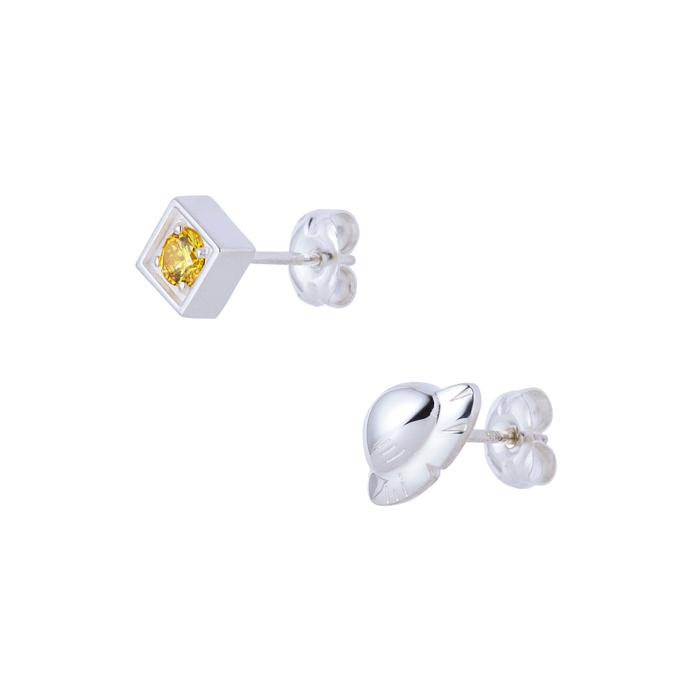 片方は帽子のモチーフ、もう一方はスクエア型の台座にイメージカラーストーンをセットしたアシンメトリーなデザイン。