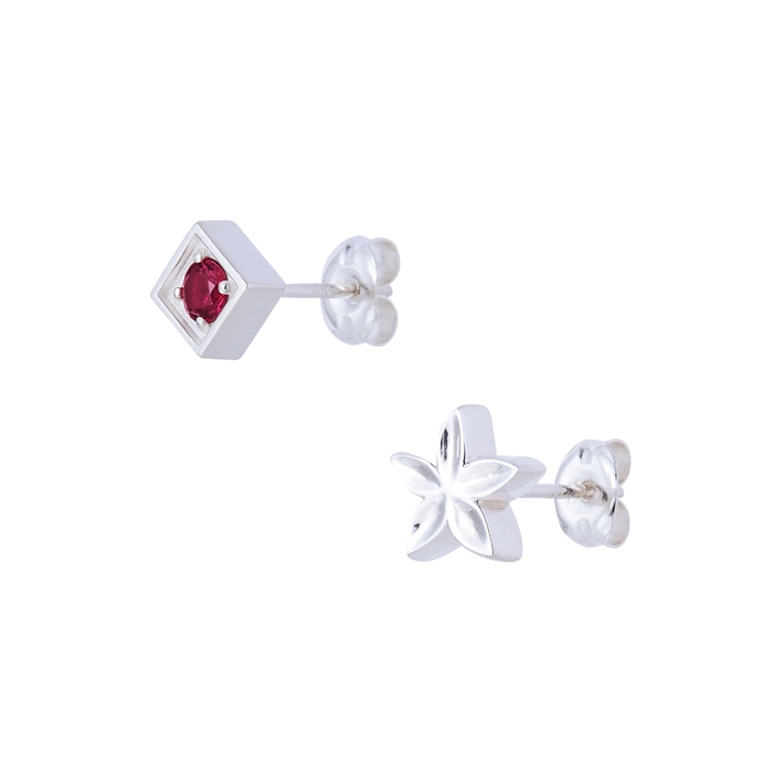 片方は髪飾りのモチーフ、もう一方はスクエア型の台座にイメージカラーストーンをセットしたアシンメトリーなデザイン。