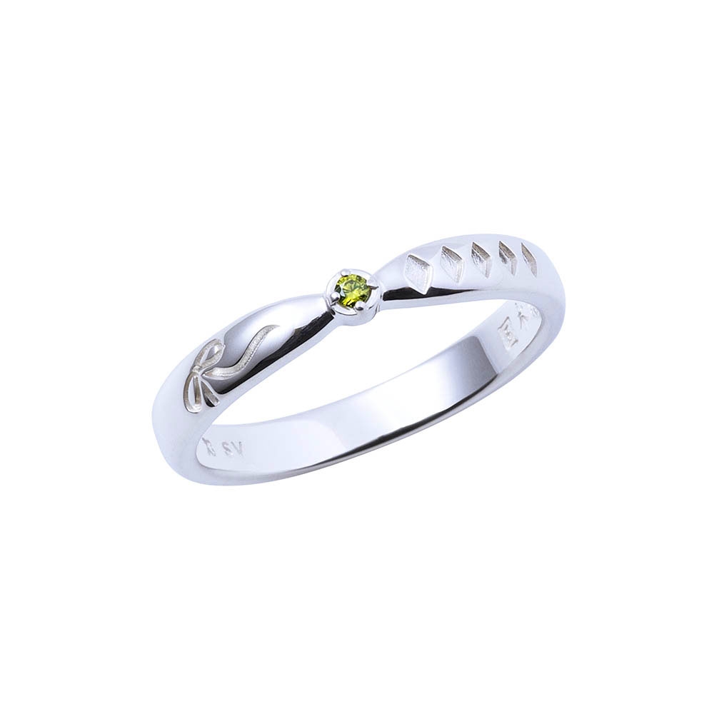 甲丸のストレートタイプのリングに髪飾りをモチーフとして取り込み、イメージカラーストーンをセット。内側には名前を刻印しました。