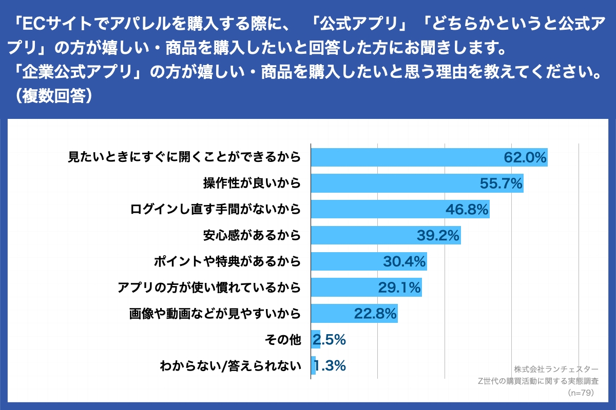 「ECサイトでアパレルを購入する際に、企業の「公式アプリ」と「公式Webサイト」のどちらの方が嬉しい・商品を購入したいと思いますか。」と質問に対して、「公式アプリ」「どちらかというと公式アプリ」と回答した人を対象に、「企業公式アプリ」の方が嬉しい・商品を購入したいと思う理由を教えてください。(複数回答)」(n=79)と質問したところ、「見たいときにすぐに開くことができるから」が62.0%、「操作性が良いから」が55.7%、「ログインし直す手間がないから」が46.8%という結果が得られた。