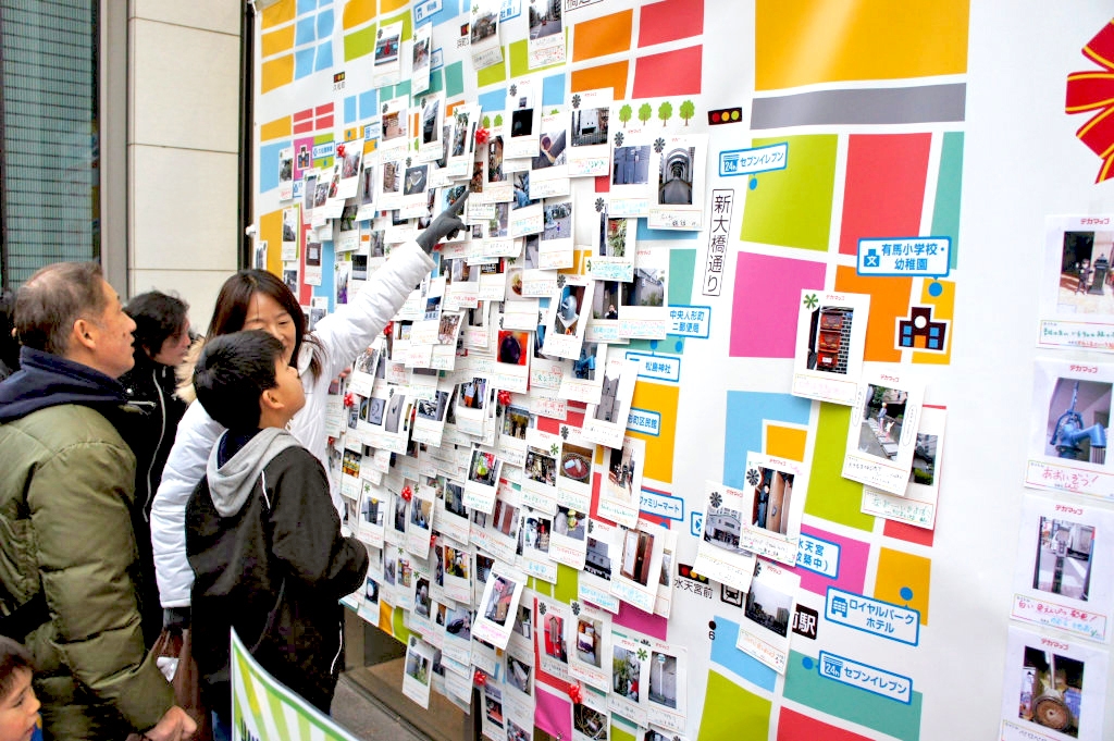 参加する子供たちが町の魅力を発見する「記者」となって、大人では見落としてしまうような隠れがちな魅力ポイントをカメラで撮影し、町が描かれた大きなマップにどんどん写真を貼り付けていくことで、町の住民でも知らないような町の魅力を可視化することができます。