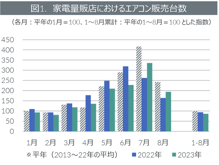 ・2023年1~8月におけるエアコン販売台数は、平年比13%減、前年比8%減と振るわなかった。