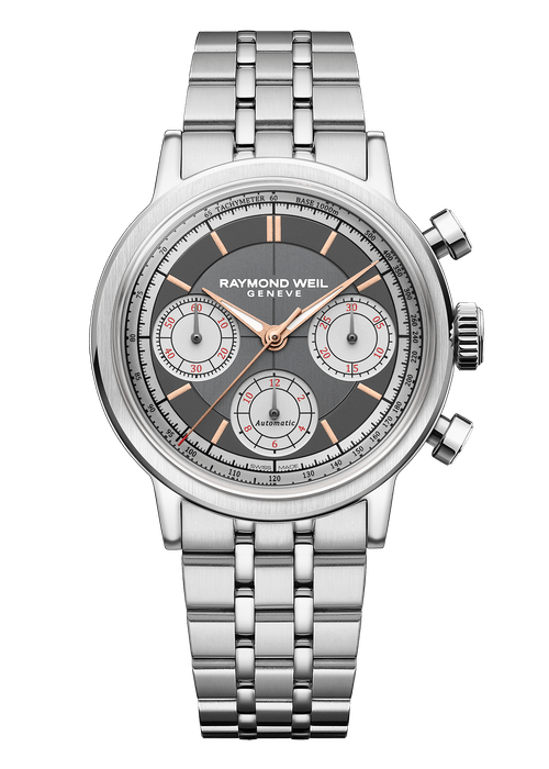ステンレススティールブレスレットは5連仕様で、ケース同様に2種類の仕上げを組み合わせています。バックル部分にレイモンド ウェイルのモノグラムを刻印しています。