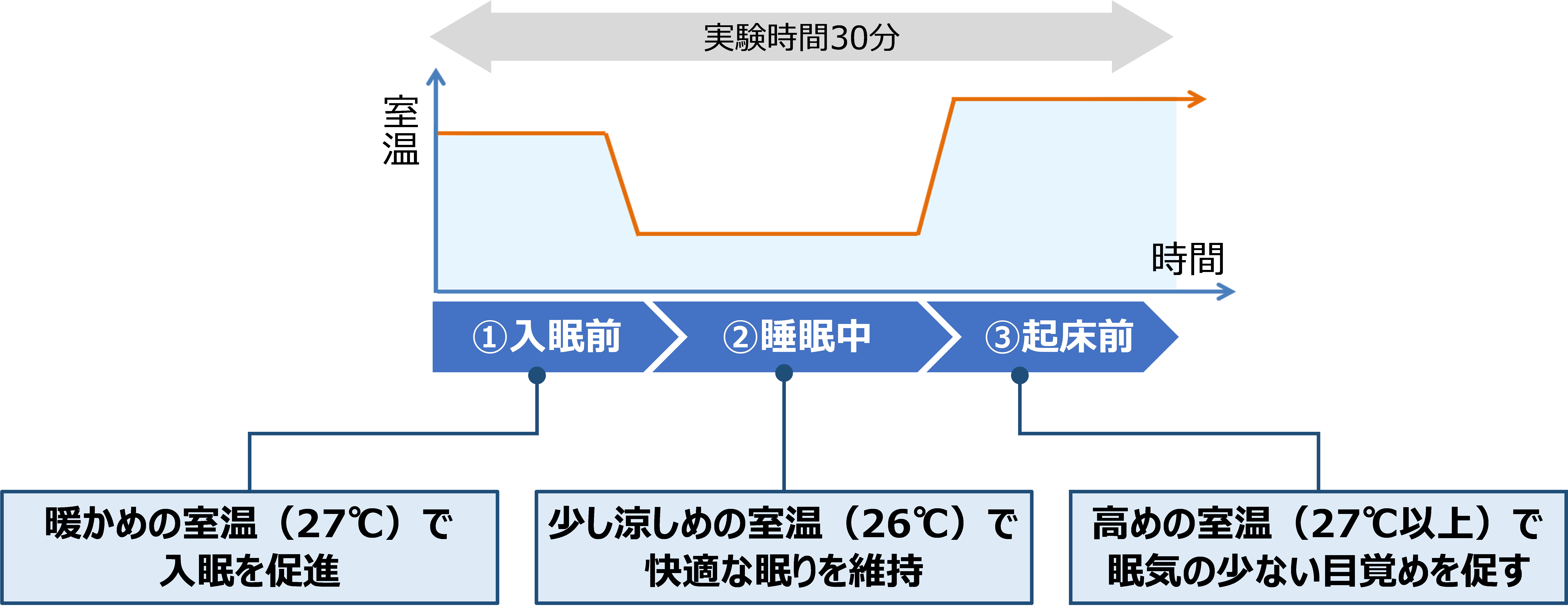 ①入眠前 … 入眠前の室温を「低め(25℃以下)・中立(26℃)・高め(27℃)」の3通りに設定し、それぞれの温度環境で入眠に要した時間を評価。