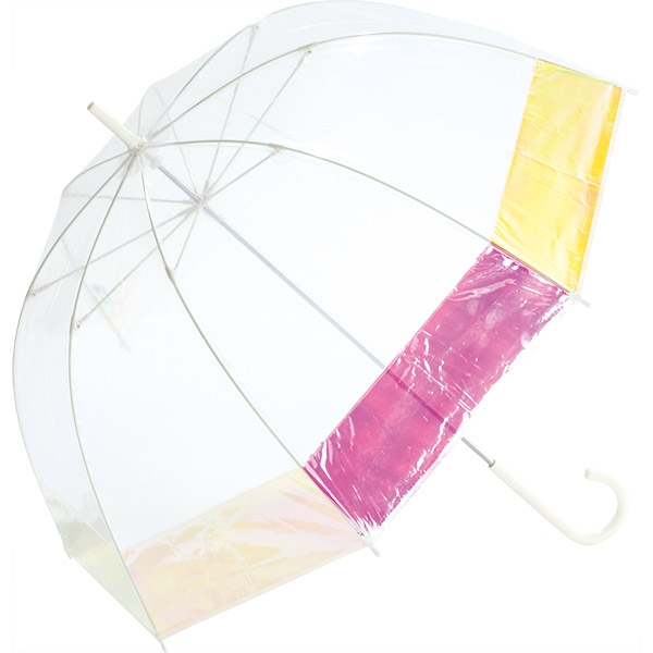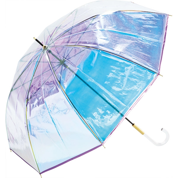 オーロラ生地にそれぞれゴールドとピンクのパイピングがデザインされています。傘の持ち手はクリアなアクリル素材を合わせているのでスタイリッシュな印象。存在感のあるオーロラ傘をコーディネートの中心に。