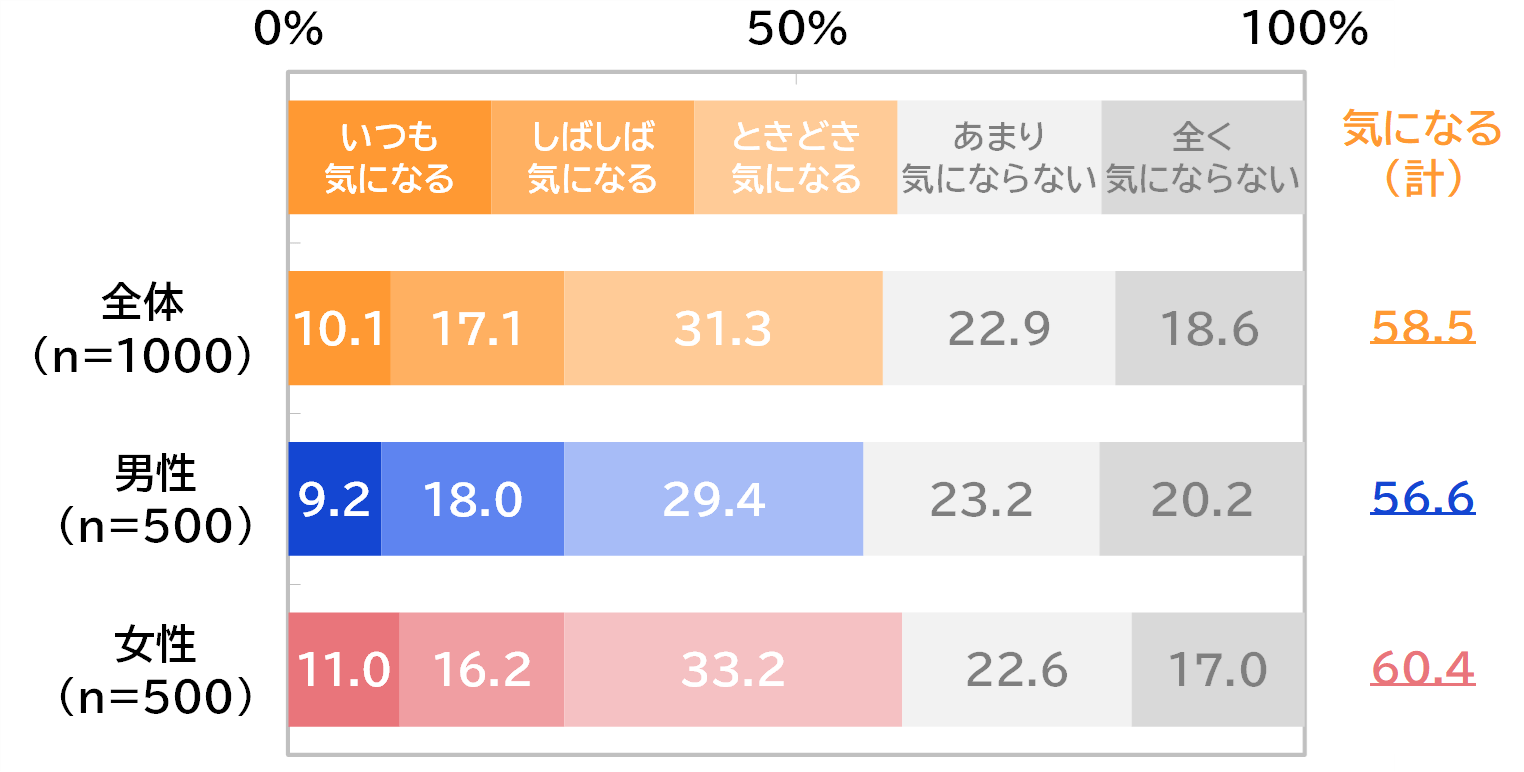 気になる人の割合を男女別にみると、男性では48.8%、女性では59.0%と女性のほうが10ポイント以上高くなっています。