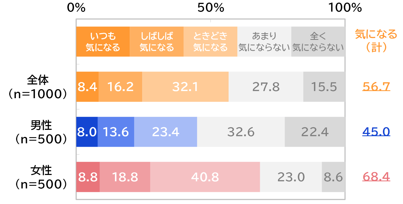 気になる人の割合を男女別にみると、男性では45.0%、女性では68.4%と女性のほうが20ポイント以上高くなっています。