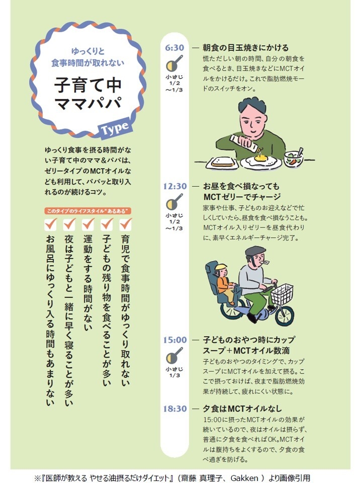 生活スタイルに合わせた摂取方法があります。例えば「運動嫌いの女子」の場合、体力がなく代謝も低いため、効果が出るまでに時間がかかることがあります。このタイプの方は、3時のおやつの時間などにMCTオイルを摂取するのがおすすめです。「子育て中のママ・パパ」や「シニア世代」など、それぞれのライフスタイルに合わせた摂取方法があります。特にシニア世代は食が細くなって低栄養になりがちで、体力がなかったり体が冷えて眠れなかったりする場合があります。MCTオイルはやせるだけでなく、体力向上や体温上昇にも効果があるため、シニア世代にも適しています。実はMCTオイルは元々介護食にも使われており、認知症予防や腸内環境改善にも効果があるとされています。また、MCTは母乳にも含まれているなど、年齢を問わず様々な世代に適した「パーフェクトなオイル」と言えるでしょう。他の生活パターンも、書籍内でご紹介しております。