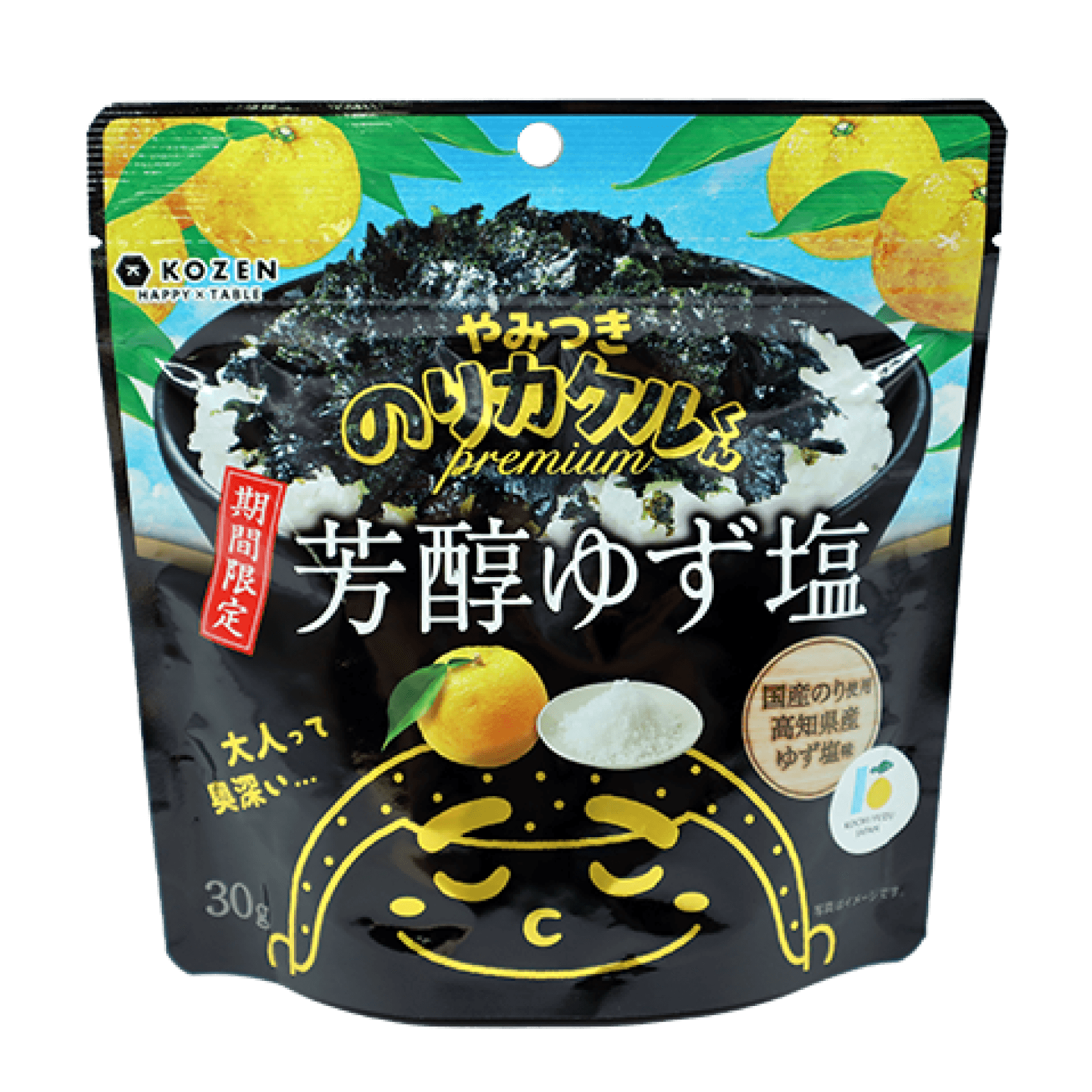 『お家で手軽に大人のプチ贅沢を』をコンセプトに立ち上げたpremiumシリーズ第4弾は、国産の原料を使用し、高知県産ゆずを使用した塩味の海苔フレーク商品です。