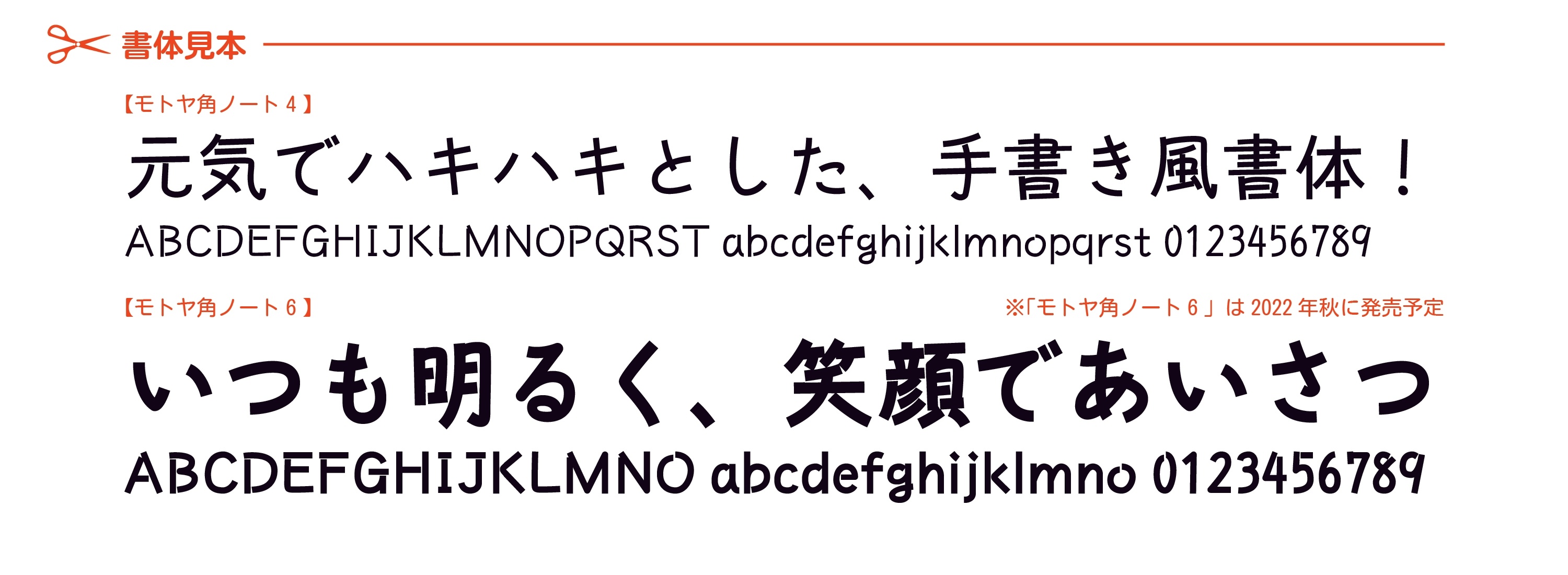 もちろん手書き風書体として、手書きならではの筆法も継承していますが、モトヤ角ノートのウエイト展開ではモトヤノートよりも一段階太めのウエイト(W4/6)を用意しており、元気で明るい表現が可能となっています。