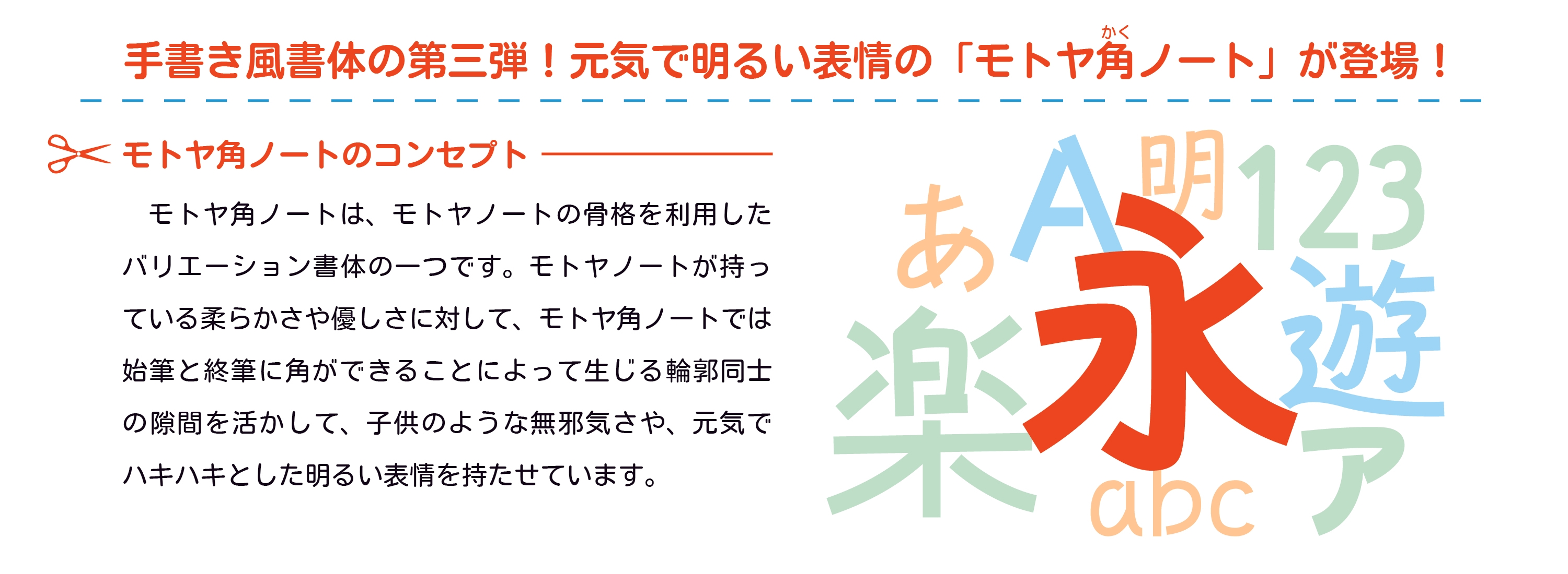 手書き風書体の第三弾となる「モトヤ角ノート」は、「モトヤノート」の骨格を利用したバリエーション書体の一つです。