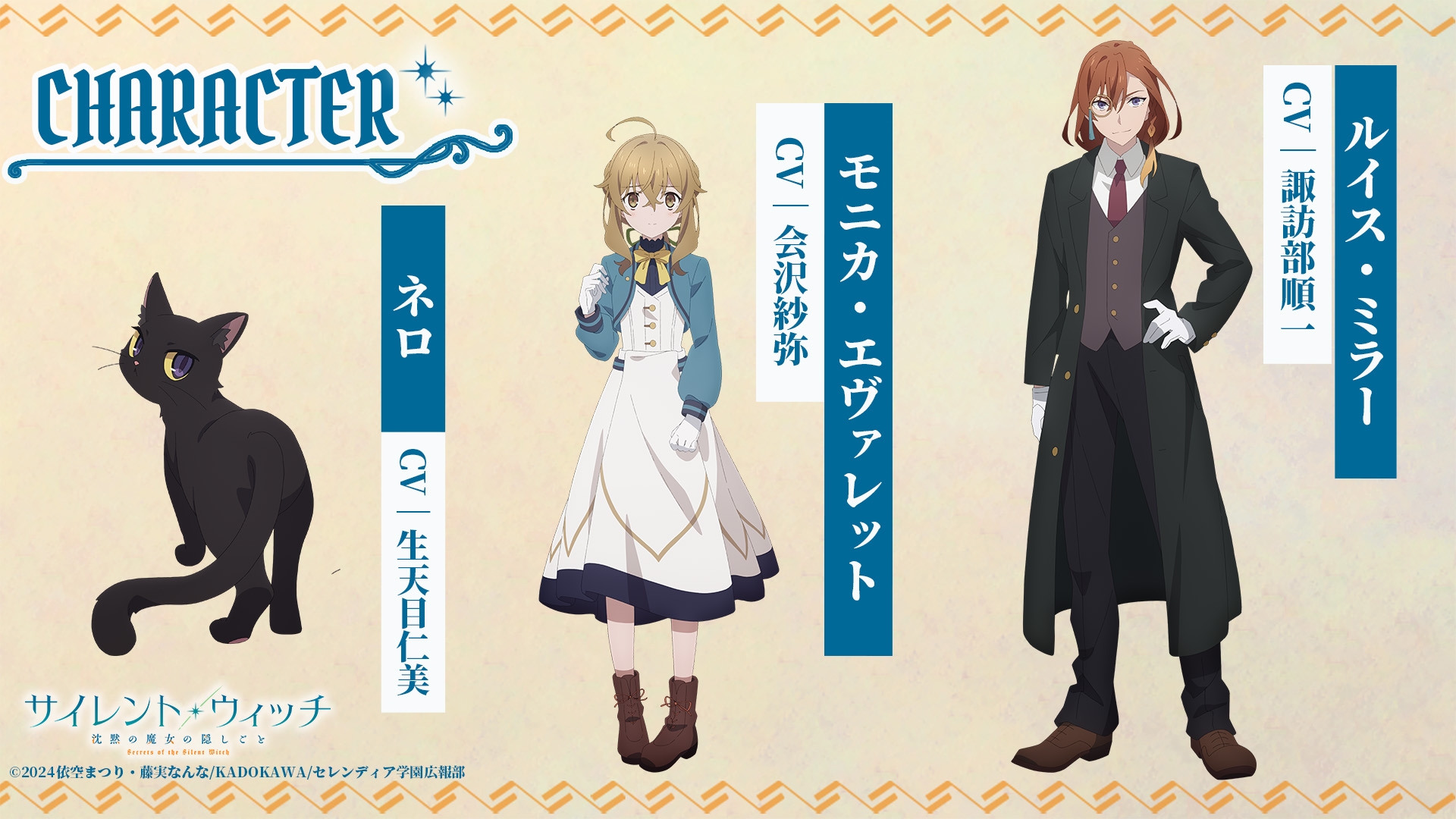 本日、アニメ『サイレント・ウィッチ 沈黙の魔女の隠しごと』のティザーPVが地上波放送にて解禁、その中で2025年放送、ティザービジュアル、追加キャラ&キャスト2名が発表。さらにアニメ公式Xでは、モニカ・ネロ・ルイスのキャラクター立ち絵イラスト/キャラプロフィールが公開されました。