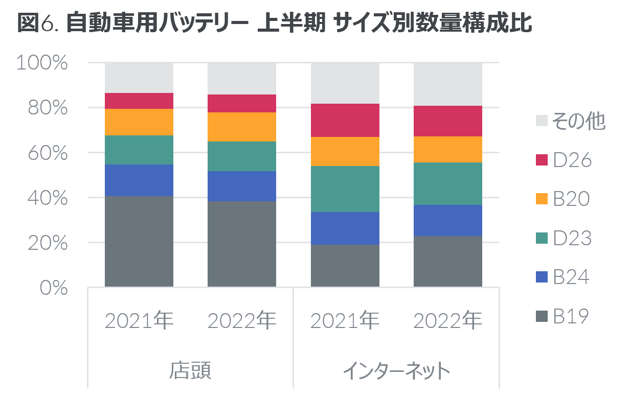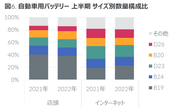 自動車用バッテリーのサイズ構成をみると、最も販売の多いB19の数量構成比は、店頭では前年同期の41%から38%に縮小した(図6)。その反面、B20、D26が増加しており、それぞれ13%、8%を占めた。インターネットではB19の販売が好調で数量前年比26%増に達し、数量構成比では19%から23%に拡大した。一方、D23は20%から19%に減少した。