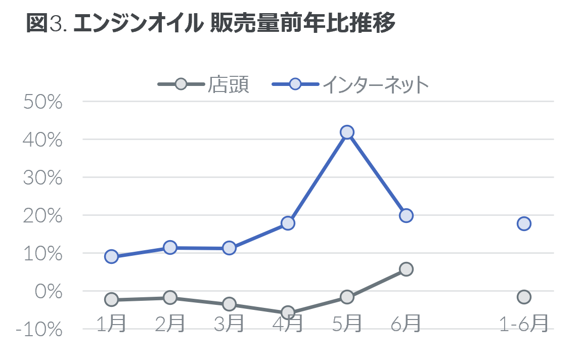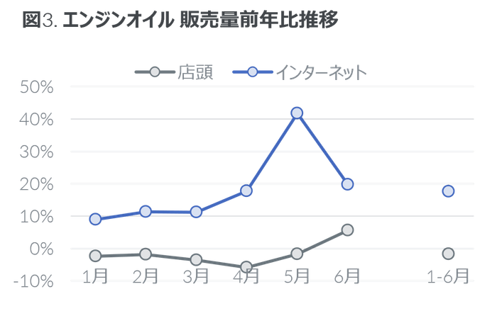 4L缶は数量前年比1%減であったが、インターネットでは同2%増と微増であった。店頭は4L缶全体では同2%減と落ち込んだなか、全合成油は同4%増と伸長した。平均価格は、店頭では3,611円と前年から横ばいであったことに対して、インターネットでは販売数量の8割を占める全合成油の価格が上昇したことで、前年同期から9%上昇した。結果、インターネットの金額前年比は11%増と二桁成長となった。