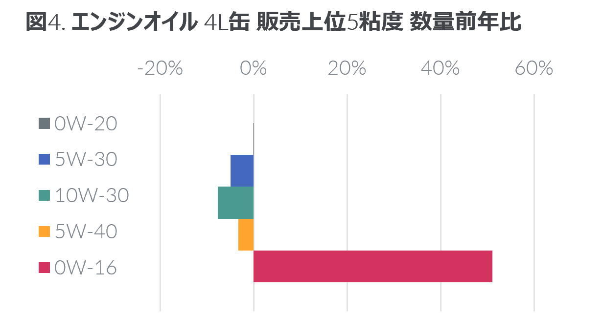 4L缶では0W-20の販売が最も多く、数量ベースで41%を占めた。対して、5W-30の数量構成比は前年同期の23%から22%に、10W-30は15%から14%に縮小した。こうした中、0W-16の販売が好調で数量前年比は51%増に達し(図4)、数量構成比は2%から4%に拡大した。