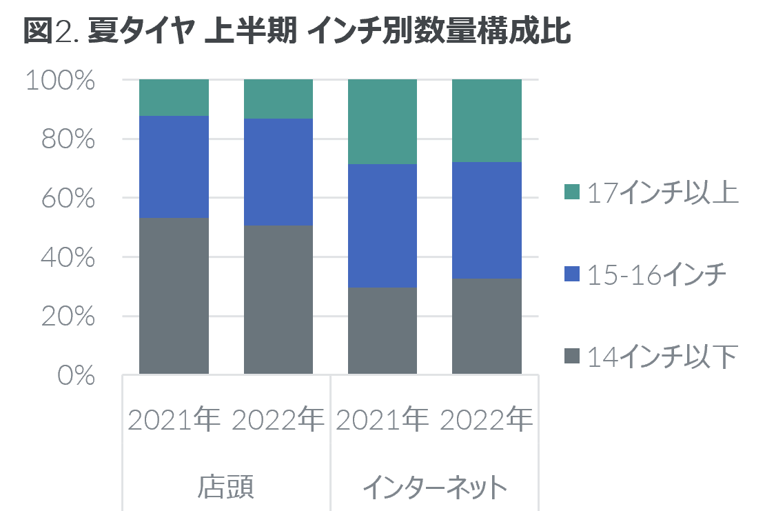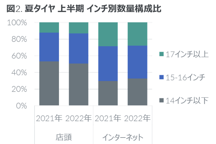 夏タイヤのサイズ構成をみると、店頭とインターネットで対照的な傾向がみられた。店頭では高インチの販売が拡大しており、17インチ以上の数量構成比は前年同期の12%から13%に拡大した(図2)。ただ店頭では14インチや15インチが引き続き主流であり、155/65/14では数量ベースで21%、195/65/15では7%を占めた。インターネットでは軽自動車に多く採用される14インチ以下が伸びており、2022年上半期の数量構成比は前年同期の29%から33%に拡大した。特に155/65/14の伸びは著しく、販売本数は前年同期の1.8倍に達した。