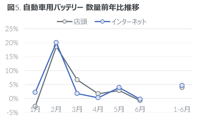 2022年上半期の数量前年比は4%増で、店頭では同4%増、インターネットでは同5%増であった(図5)。月別にみると、昨年より気温が低かった2月は店頭では数量前年比19%、インターネットでは同20%増と大幅に増加した。店頭ではハイブリッド車向け製品が好調で数量前年比26%増と大きく伸長したことで、店頭の平均価格は13,432円と3%上昇した。インターネットではアイドリングストップ車向け製品の価格上昇の影響が大きく、平均価格は9,550円と3%上昇した。結果、金額前年比は店頭では7%増、インターネットでは8%増と堅調であった。