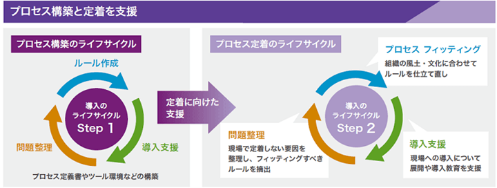 本サービスはプロセスを定着させるため、プロジェクトの特性に合わせてプロセスをフィッティングすることを主な特長としており、そのフィッティングに必要となる診断や各種支援を取り揃えています。
