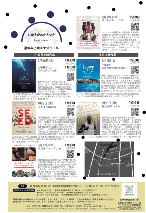 上映予定詳細はインスタグラムアカウント「じゆうがおかえいが 」にて配信。オンラインチケット予約または自由が丘のファッションショップ・カフェ・レストランなどでチケットの購入が可能。