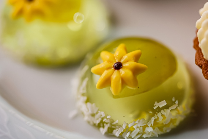 ■メニュー内容:ひまわりクッキー/はちのお家のダブルチーズケーキ/ココナッツミルクの鉢植えパンナコッタ/紅茶とオレンジのオペラ/ひまわりマンゴータルト/さわやかマスカットジュレ/チョコレートマカロン/はちみつレモンのムース/スコーン(ハニーレモンソース)