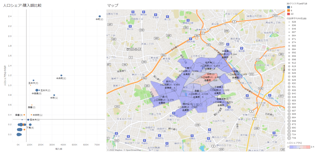 店舗の会員データを町丁目ポリゴンに取り込み、国勢調査データ(人口総数)を使ったシェア分析を実施。同時に世帯数に対する顧客シェアと購入額の関係をグラフ表示することで、会員動向の迅速な把握を実現。店舗運営の効率化と売上の拡大に向けた施策の立案をスピーディーに実施可能となります。