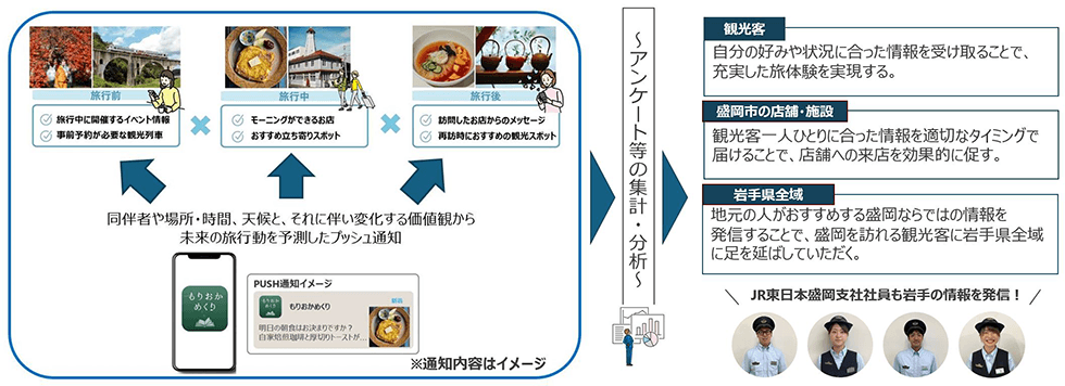 JR東日本盛岡支社の社員が岩手県内のおすすめグルメや観光地等を紹介するコンテンツを「もりおかめくり」上で公開し、盛岡を訪れた観光客に岩手県内の他のエリアにも足を延ばしていただく新たな旅体験の創出を目指します。