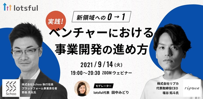 総合人材サービス、パーソルグループのパーソルイノベーション株式会社(本社:東京都港区、代表取締役社長:長井 利仁)が運営する副業人材マッチングサービス「lotsful(ロッツフル)」(https://lotsful.jp/)は、2021年9月14日(火)19:00から「新領域への0→1 実践!ベンチャーにおける事業開発の進め方」をテーマにオンラインセミナーを開催します。