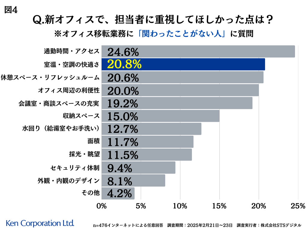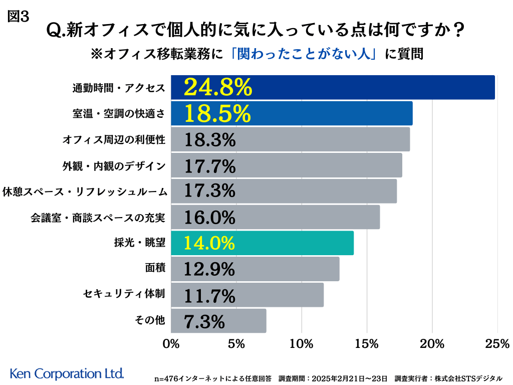 高級住宅ほかオフィス賃貸仲介も行う総合不動産の株式会社ケン・コーポレーション(本社:東京都港区、代表取締役社長:中川 堅悟)は、多様化する働き方とオフィスの在り方の変化を受け、オフィス選択の満足度を左右する項目について、オフィス移転業務に関わったことのある人(以下「担当者」)、関わったことのない人(以下「従業員」)それぞれにアンケート調査を行いました。その結果、オフィス選択時に重要視すべき項目、すなわち満足度を上げるためのカギが明らかとなりました。