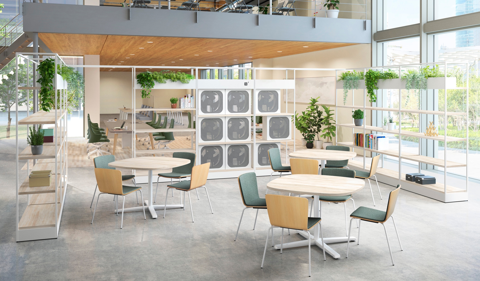 ウィンドユニットと通気性のよいLivesシェルフと組み合わせて配置することで、空気の流れをつくります。窓やエアコンの近くなど、座席レイアウトで生じる「空気のムラ」も解消できます。