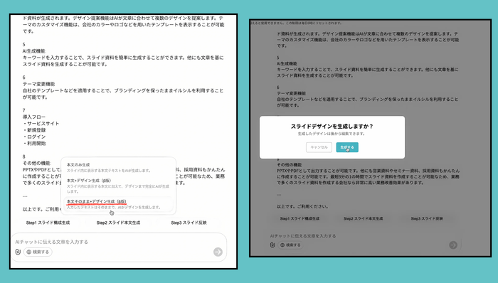 生成されたプロンプトをもとに、「スライド本文生成」ボタンを押し、その中から「本文そのまま+デザイン生成(β版)」を選択することで、スライドの本文が文章そのままに作成されます。