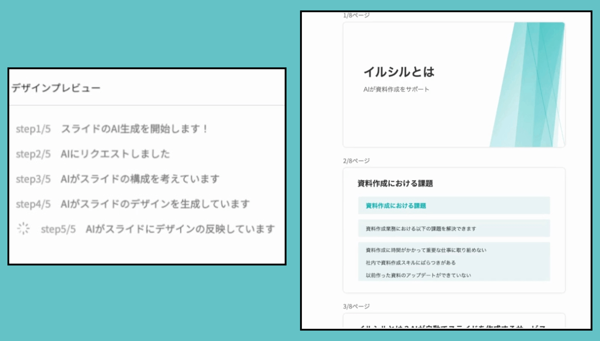 株式会社イルシル(本社:東京都渋谷区、代表取締役:宮﨑 有貴)は、AI搭載スライド自動生成サービス「イルシル」にて、「本文そのまま+デザイン生成(β版)」を新たに搭載しました。