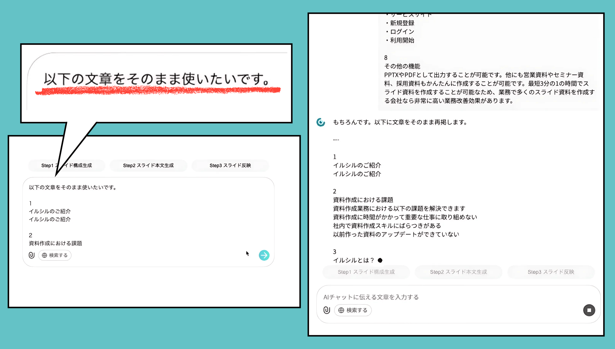 まず、AIチャットにスライド化したい文章をそのまま貼り付け、「文章をそのまま使いたい」と指示します。その後矢印ボタンを押してAIチャットに送信します。