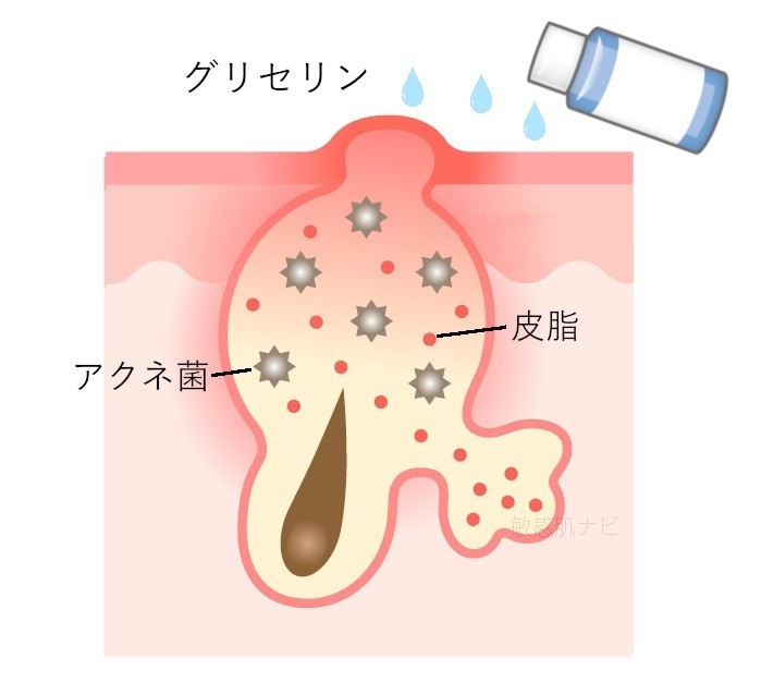 グリセリンはアクネ菌のえさになる → アクネ菌が増える → グリセリンを塗るとニキビが増える