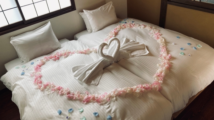 宿ルKYOTO HANAREではお客様のご利用用途に合わせてサプライズの演出のお手伝いをさせていただきます。チェックイン前やお出かけの間等ご要望に応じてお部屋にサプライズの装飾を施したり、お花をご準備させていただきます。