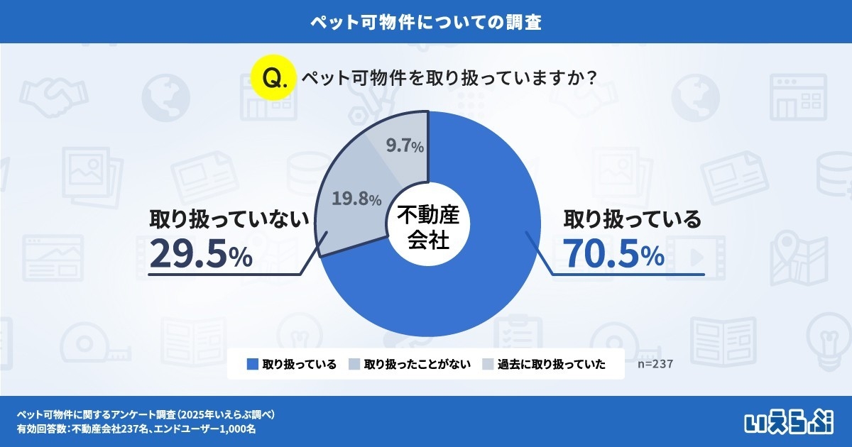 不動産業界特化のDX支援サービスを展開する、株式会社いえらぶGROUP(本社:東京都新宿区、代表取締役:岩名泰介、以下「いえらぶGROUP」)は、不動産会社・エンドユーザーに対して「住まい探しにおけるペット可物件に関してのアンケート調査」を実施しました。不動産会社237名、エンドユーザー1,000名、有効回答1,237件の調査結果を発表します。