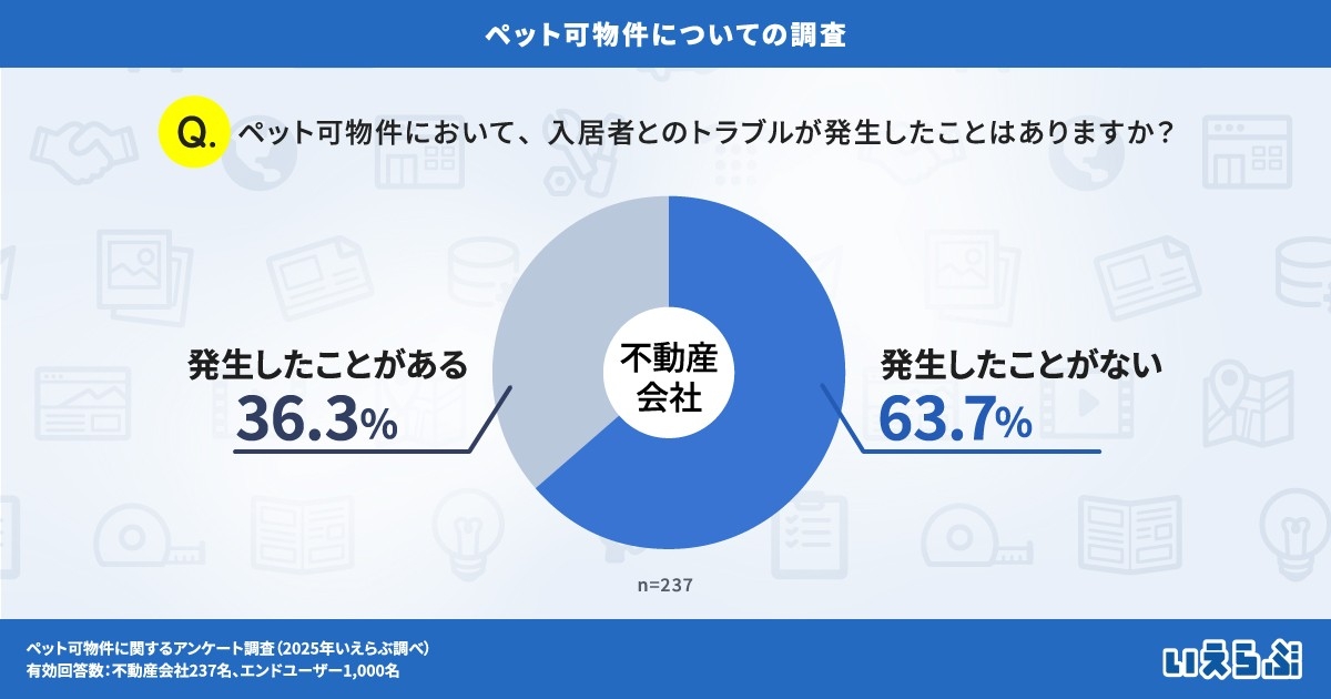 2.36.3%の不動産会社が入居者とのトラブルがあったと回答、ペット可物件でのトラブル第1位は、鳴き声などの騒音トラブル(33.3%)
